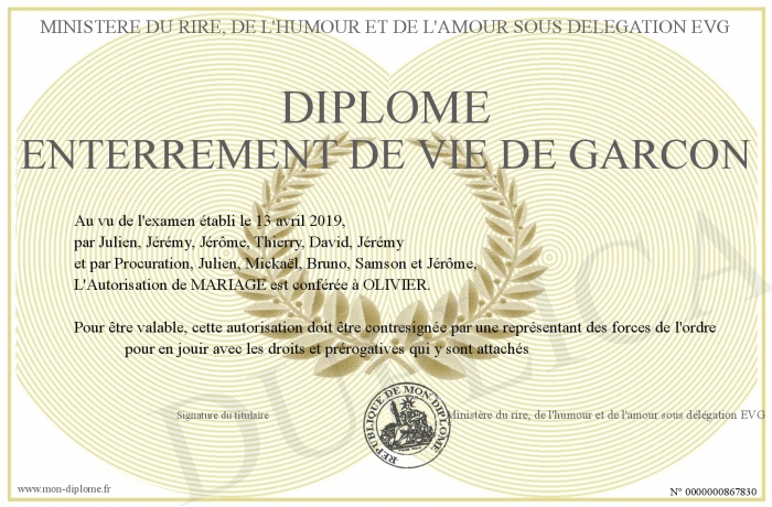Envoyez par email votre Diplome enterrement de vie de garcon personalisé