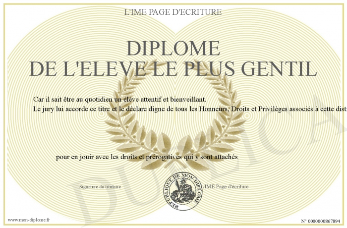 Envoyez par email votre Diplôme de l'élève le plus gentil personalisé