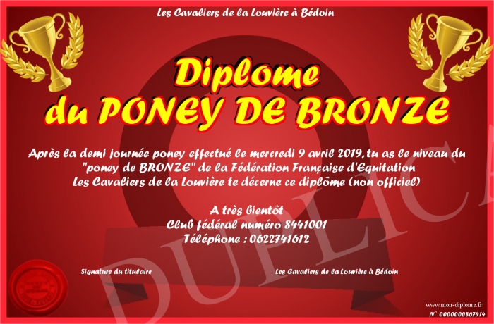 Envoyez par email votre Diplôme du PONEY DE BRONZE personalisé