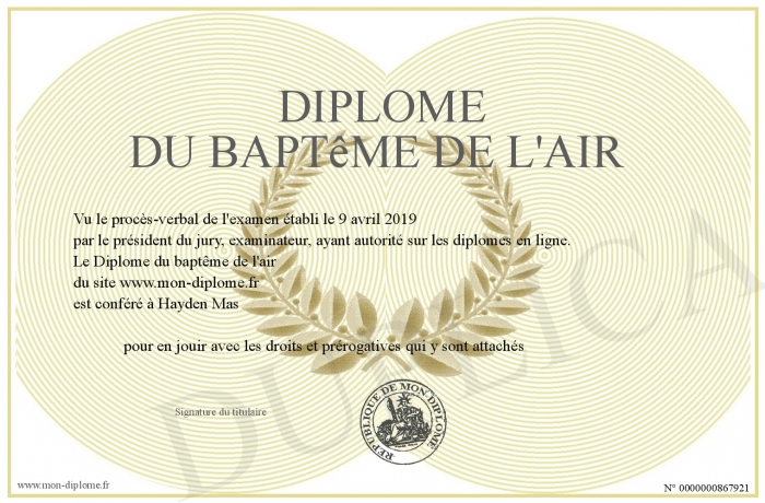 Envoyez par email votre Diplôme du baptême de l'air personalisé