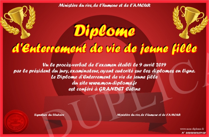 Envoyez par email votre Diplome d'Enterrement de vie de jeune fille personalisé