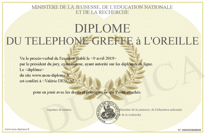 Envoyez par email votre Diplôme du téléphone greffé à l'oreille personalisé