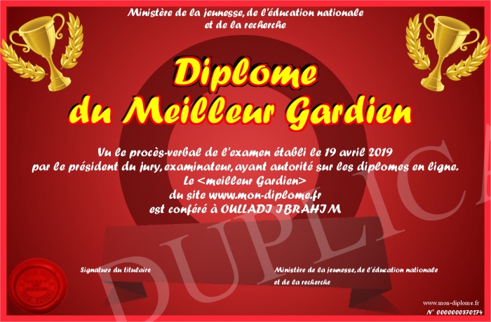 Envoyez par email votre Diplôme du Meilleur Gardien personalisé
