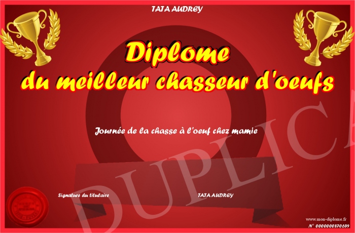 Envoyez par email votre Diplome du meilleur chasseur d'oeufs personalisé