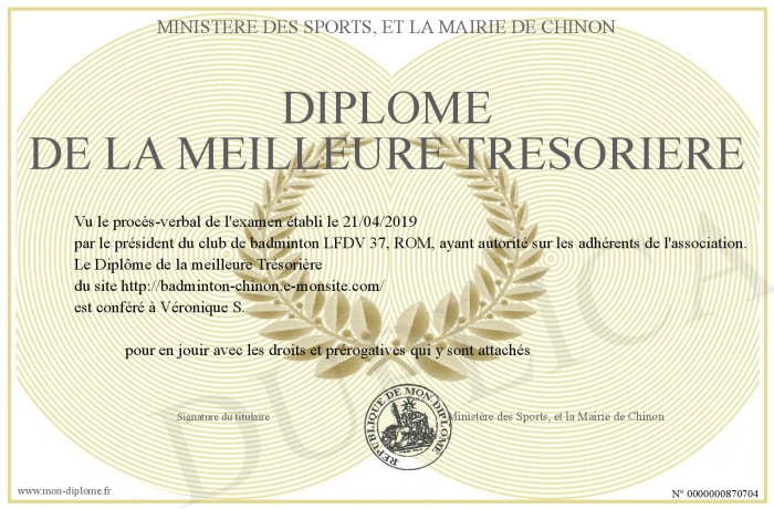 Envoyez par email votre Diplôme de la meilleure Trésorière personalisé