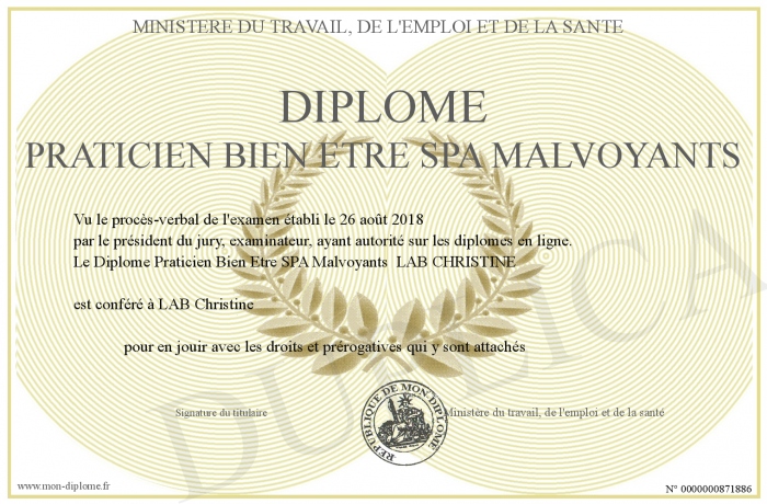 Envoyez par email votre Diplome Praticien Bien Etre SPA Malvoyants personalisé