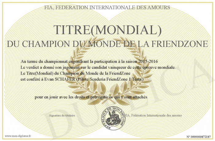 Envoyez par email votre Titre(Mondial) du Champion du Monde de la FriendZone personalisé