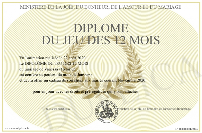Envoyez par email votre Diplôme du jeu des 12 mois personalisé