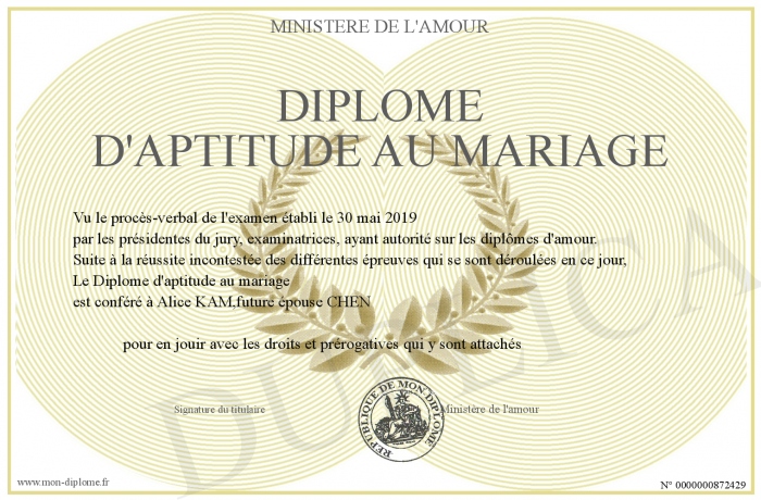 Envoyez par email votre Diplome d'aptitude au mariage personalisé