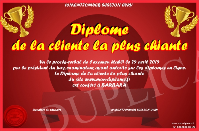 Envoyez par email votre Diplôme de la cliente la plus chiante personalisé