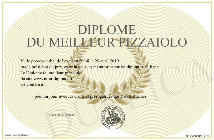 Envoyez par email votre Diplôme du meilleur pizzaiolo personalisé