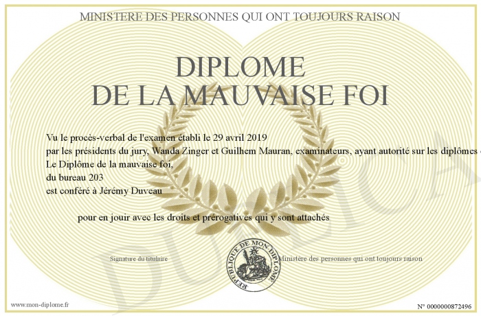 Envoyez par email votre Diplôme de la mauvaise foi personalisé