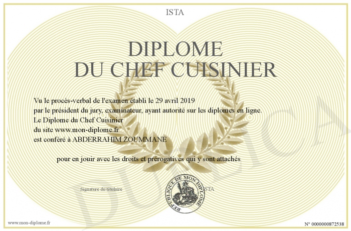 Envoyez par email votre Diplôme du Chef Cuisinier personalisé