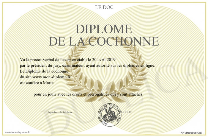 Envoyez par email votre Diplôme de la cochonne personalisé