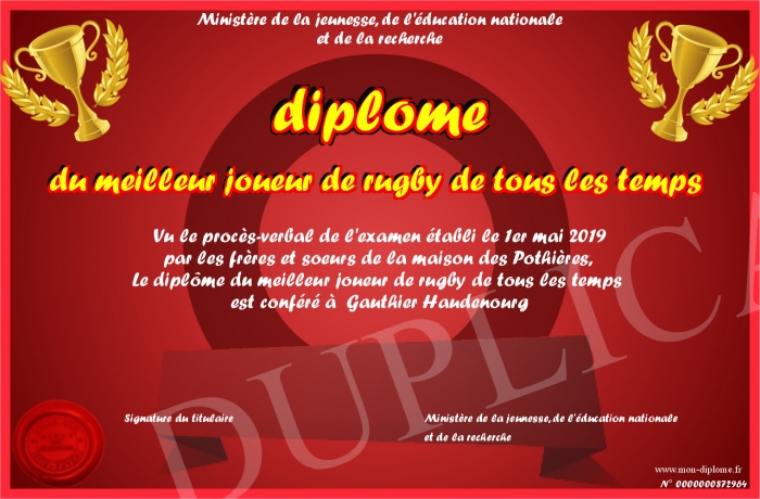 Envoyez par email votre diplome du meilleur joueur de rugby de tous les temps personalisé