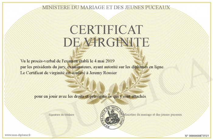 Envoyez par email votre Certificat de virginité personalisé