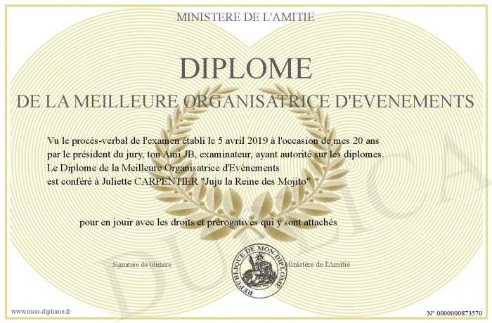 Envoyez par email votre Diplome de la Meilleure Organisatrice d'Evènements personalisé