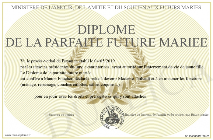 Envoyez par email votre Diplôme de la parfaite future mariée personalisé