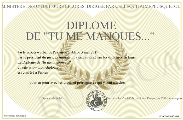 Envoyez par email votre Diplôme de -tu me manques...- personalisé