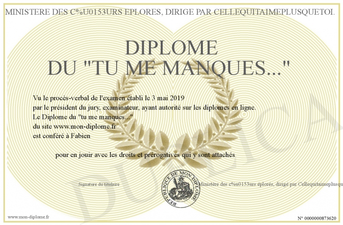 Envoyez par email votre Diplôme du -tu me manques...- personalisé