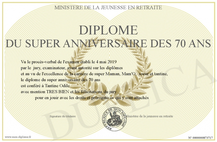 Envoyez par email votre diplôme du super anniversaire des 70 ans personalisé