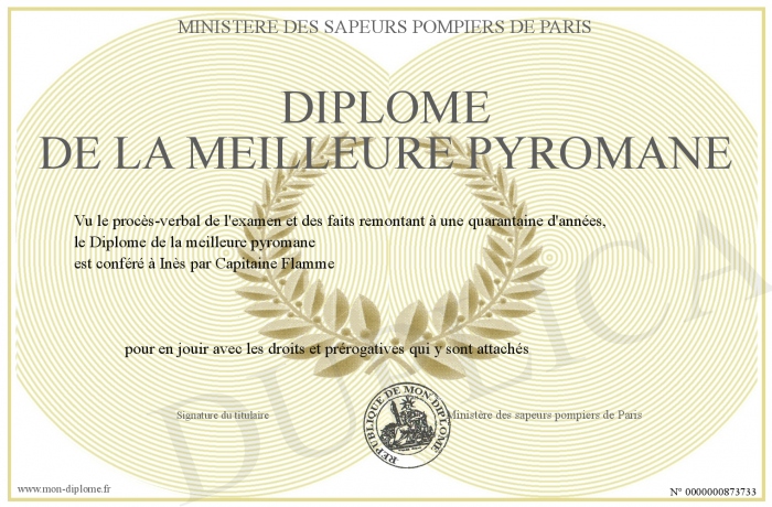 Envoyez par email votre Diplôme de la meilleure pyromane personalisé