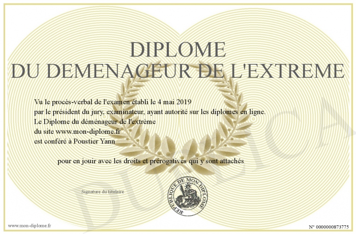 Envoyez par email votre Diplôme du déménageur de l'extrème personalisé