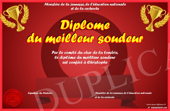 Envoyez par email votre Diplôme du meilleur soudeur personalisé