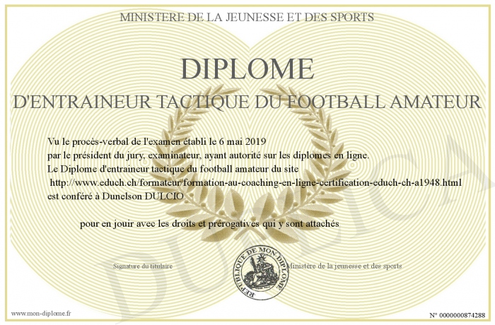 Envoyez par email votre Diplôme d'entraineur tactique du football amateur personalisé