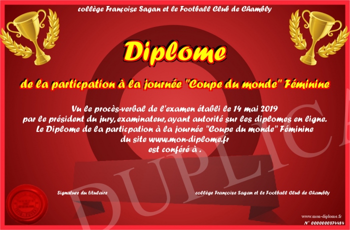 Envoyez par email votre Diplôme de la particpation à la journée -Coupe du monde- Féminine personalisé