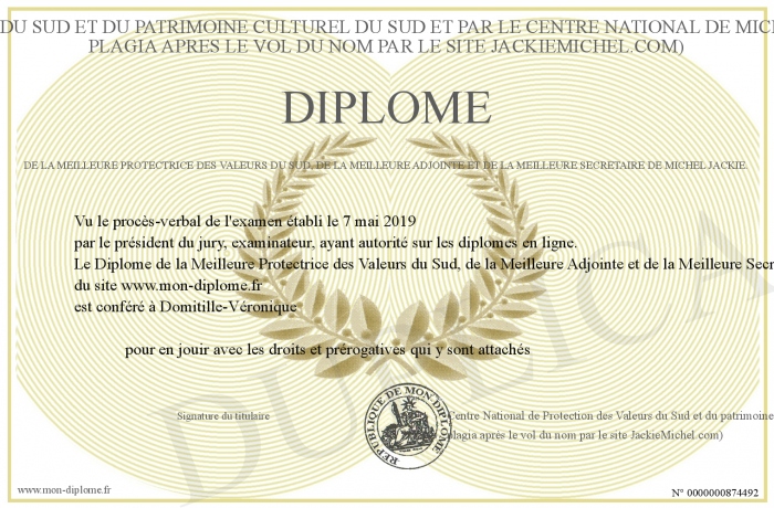 Envoyez par email votre Diplôme de la Meilleure Protectrice des Valeurs du Sud, de la Meilleure Adjointe et de la Meilleure Secrétaire de Michel Jackie. personalisé