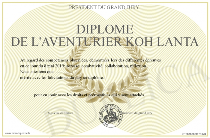 Envoyez par email votre Diplôme de l'aventurier Koh Lanta personalisé