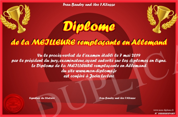 Envoyez par email votre Diplôme de la MEILLEURE remplaçante en Allemand personalisé