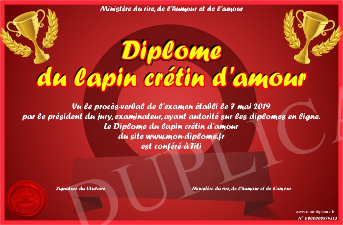 Envoyez par email votre Diplôme du lapin crétin d'amour personalisé