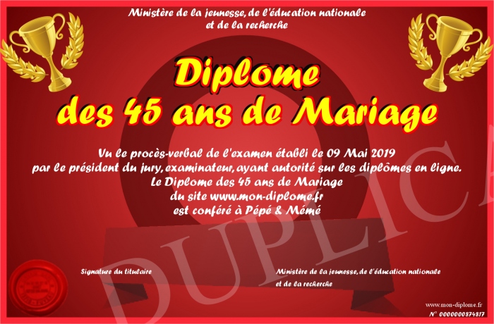 Envoyez par email votre Diplôme des 45 ans de Mariage personalisé