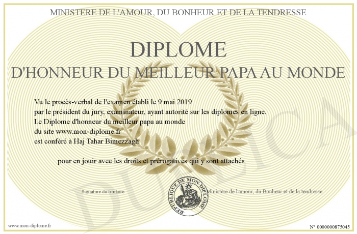 Envoyez par email votre Diplôme d'honneur du meilleur papa au monde personalisé