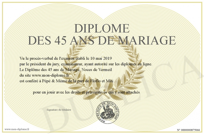 Envoyez par email votre Diplôme des 45 ans de Mariage personalisé