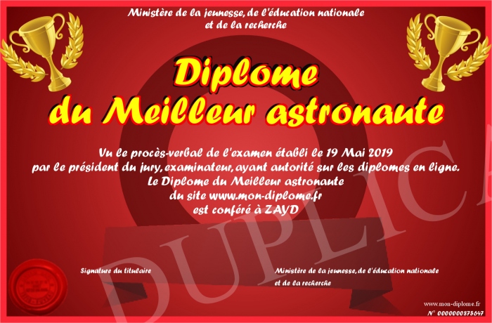 Envoyez par email votre Diplôme du Meilleur astronaute personalisé