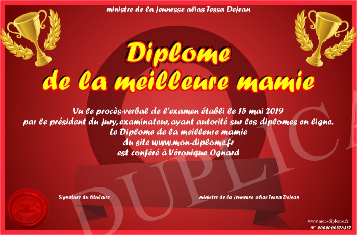 Envoyez par email votre Diplôme de la meilleure mamie personalisé