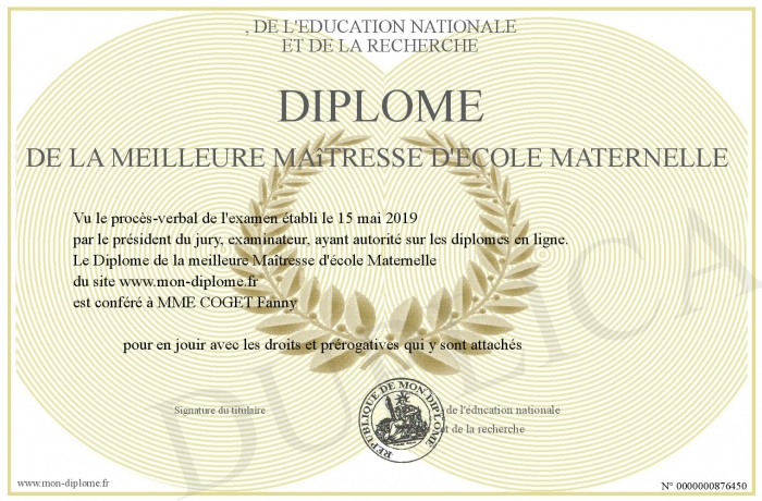 Envoyez par email votre Diplôme de la meilleure Maîtresse d'école Maternelle personalisé