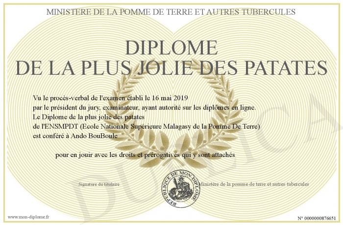 Envoyez par email votre Diplôme de la plus jolie des patates personalisé