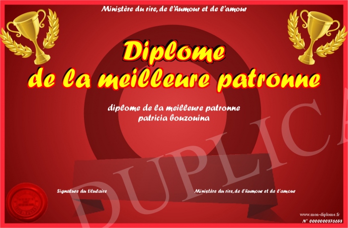 Envoyez par email votre Diplome de la meilleure patronne personalisé