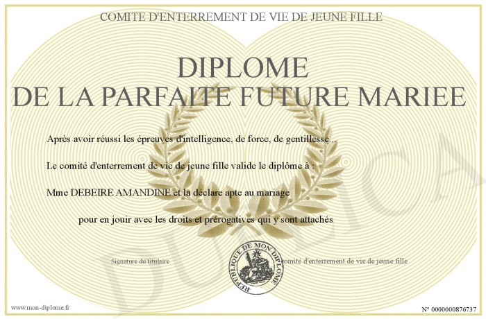Envoyez par email votre Diplôme de la PARFAITE FUTURE MARIEE personalisé
