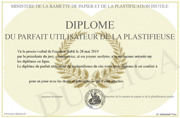 Envoyez par email votre Diplôme du parfait utilisateur de la plastifieuse personalisé