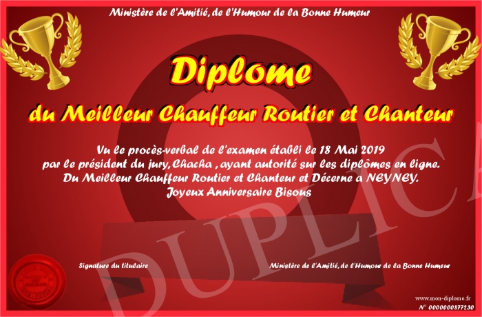 Envoyez par email votre Diplôme du Meilleur Chauffeur Routier et Chanteur personalisé