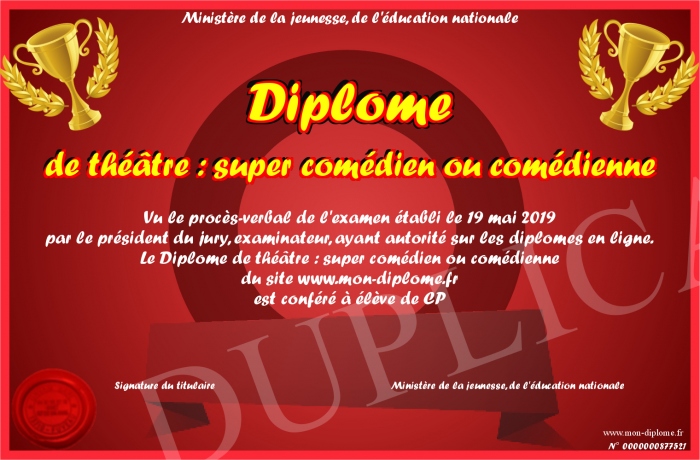 Envoyez par email votre Diplôme de théâtre : super comédien ou comédienne personalisé
