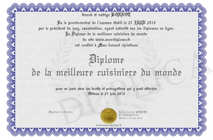 Envoyez par email votre Diplôme de la meilleure cuisiniere du monde personalisé