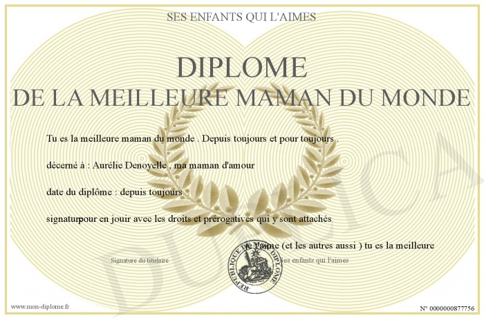 Envoyez par email votre Diplôme de la meilleure maman du monde personalisé