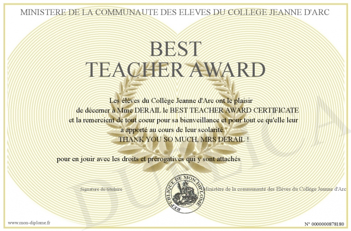 Envoyez par email votre BEST TEACHER AWARD personalisé