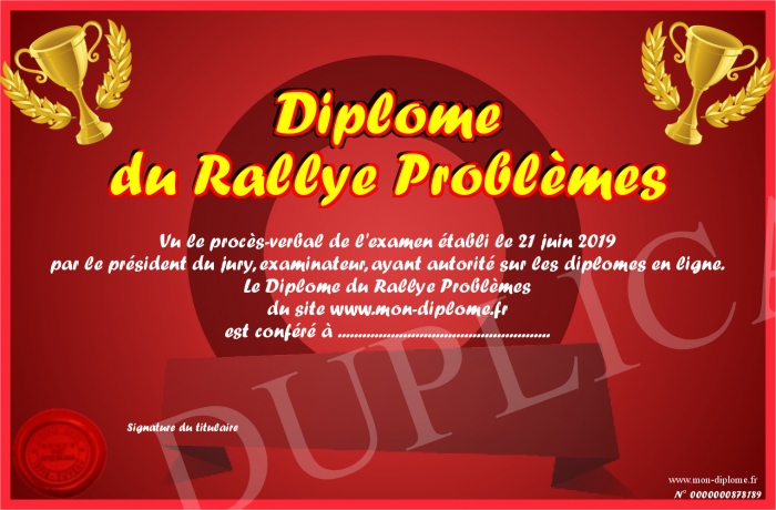 Envoyez par email votre Diplôme du Rallye Problèmes personalisé